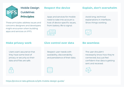 These guidelines comprise of two main parts, research and design. Both include investigation and exploration of more extensive mobile sharing and receiving workflows of iOS and Android mobile operating systems. These guidelines provide a foundational effort towards IPFS on mobile platforms, informing both IPFS feature prioritisation as well as ecosystem and community building on the protocol.