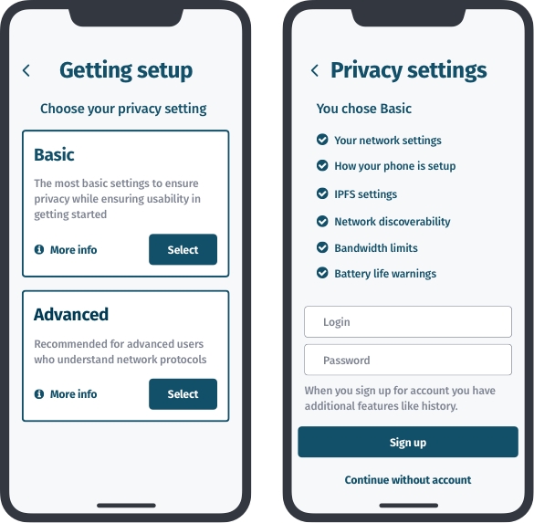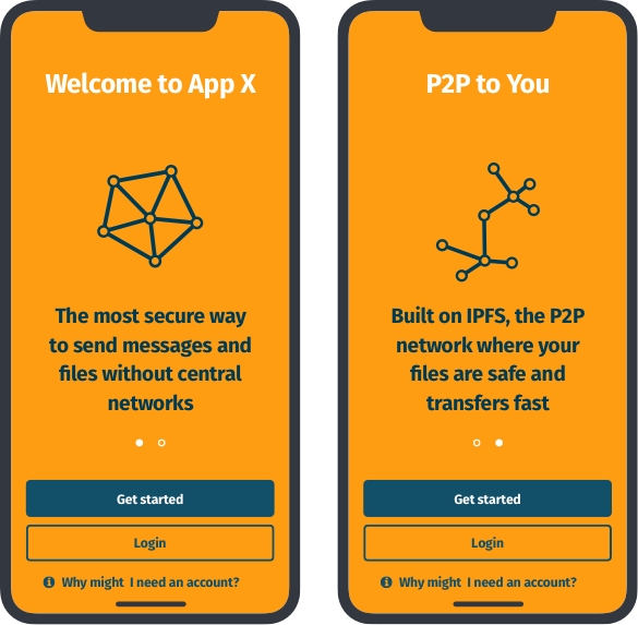 When first opening App X the user sees quick messaging about what the app does. This is followed on the second paginated screen by information about how it does that with IPFS.